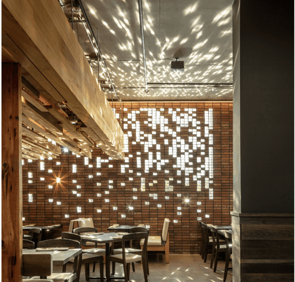 Cette technique a été utilisée par le studio Tres Birds pour le design du restaurant UCHI, à Denver, aux USA (qui donne de l’eau à la bouche!).