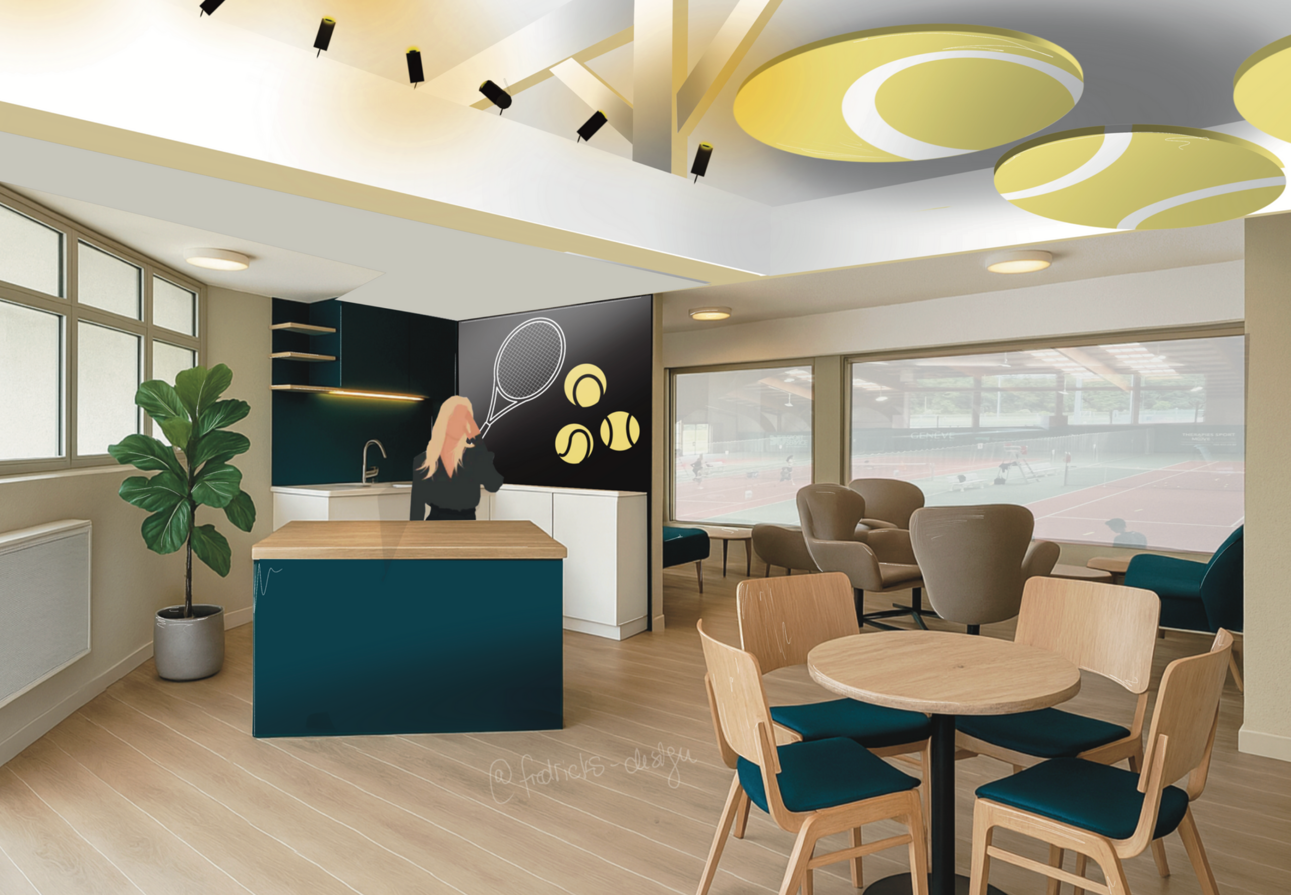 Teintes vertes et jaunes, en écho aux couleurs du tennis et à l’univers du club,